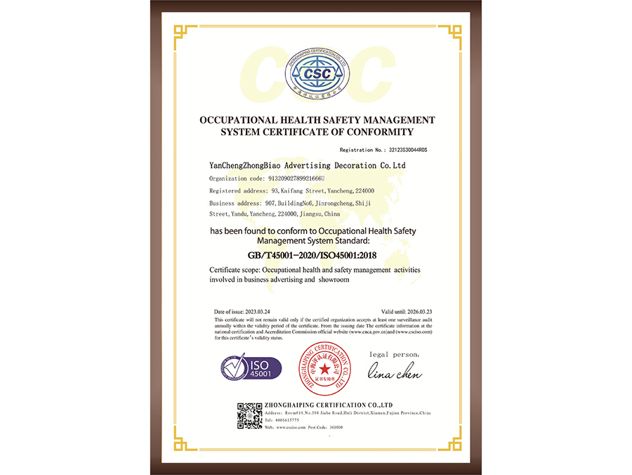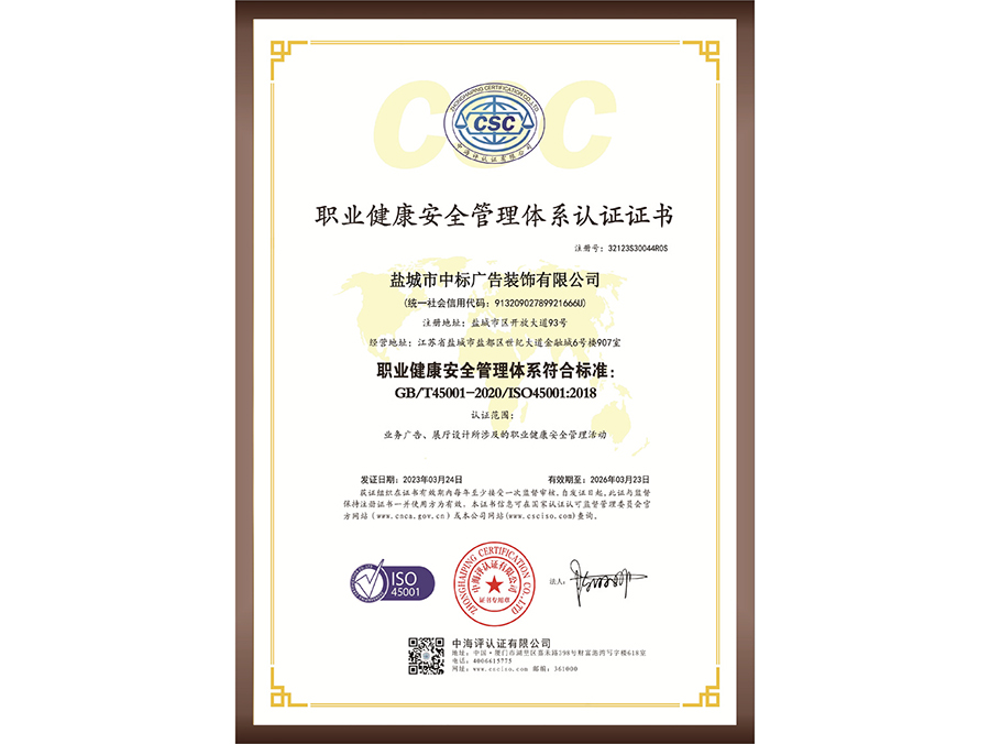 職業(yè)健康安全管理體系認(rèn)證證書